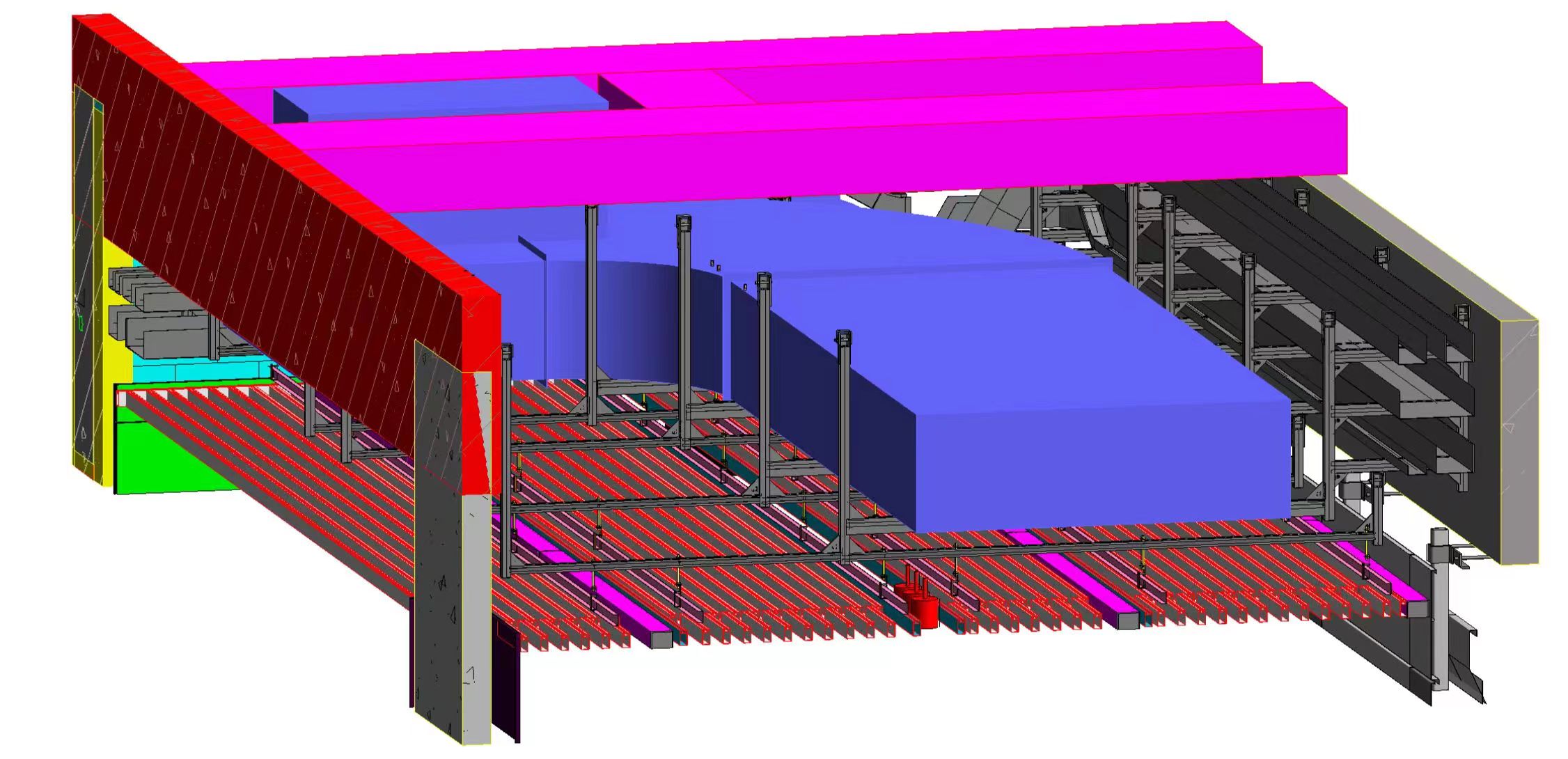本工程分三個(gè)標(biāo)段,合計(jì)總建筑面積為56.1萬㎡,建筑最高高度34.8m,其中一、三標(biāo)段為多層大跨度鋼結(jié)構(gòu)廠房。眾所周知,對(duì)于鋼結(jié)構(gòu)廠房支架設(shè)計(jì)一直是行業(yè)內(nèi)的難題。華固充分利用BIM技術(shù),自主研發(fā)的成品